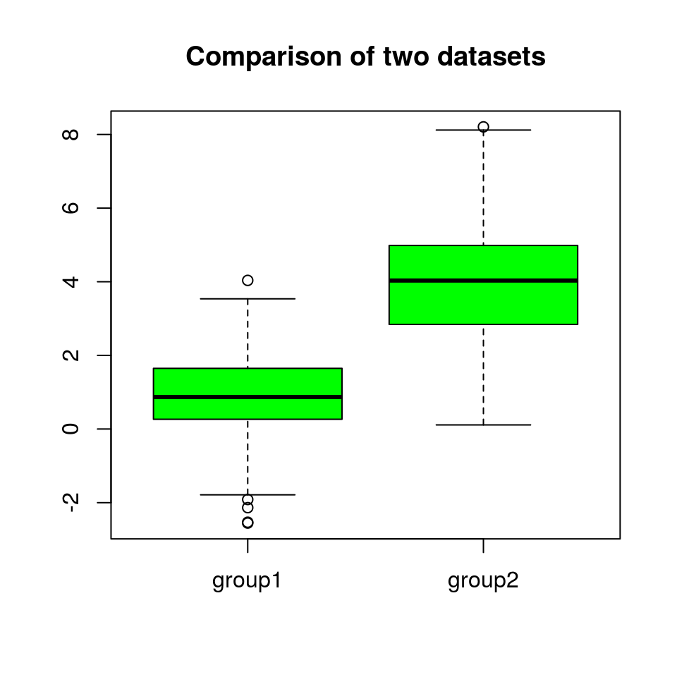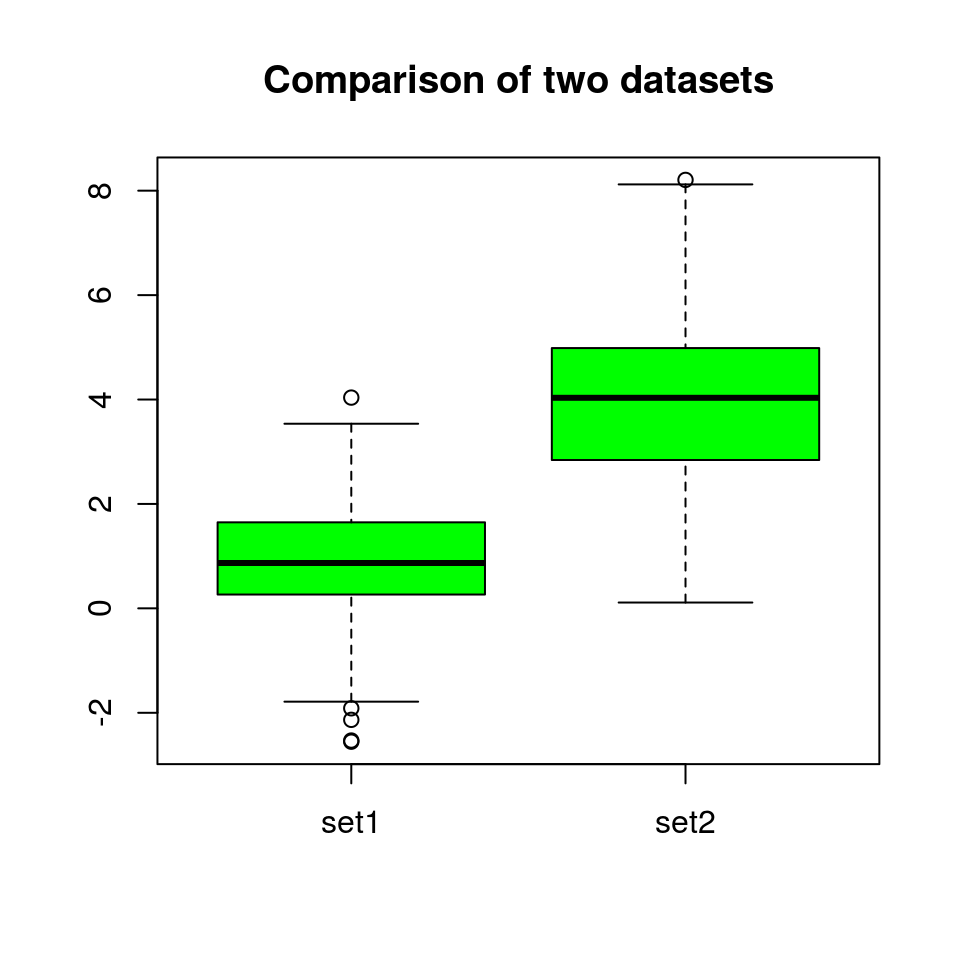 boxplot(sets, col="green", names=c("set1", "set2"), main="Comparison of two datasets")