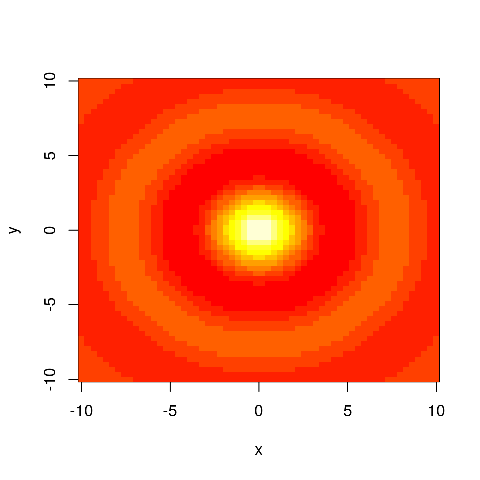 f <- function(x,y) { r <- sqrt(x^2+y^2); 10 * sin(r)/r }