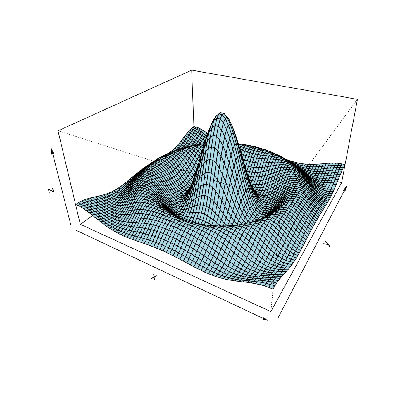 persp(x, y, z, theta = 30, phi = 30, expand = 0.5, col = "lightblue")