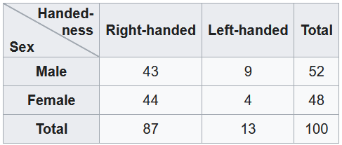 chapter)fisher.test()We use this example from Wikipedia, where the handedness of men and women was compared: