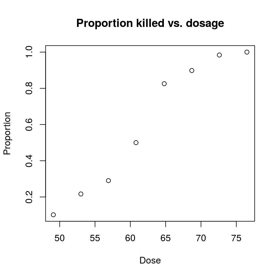 plot(Proportion ~ Dose, data = beetles, main = "Proportion killed vs. dosage")