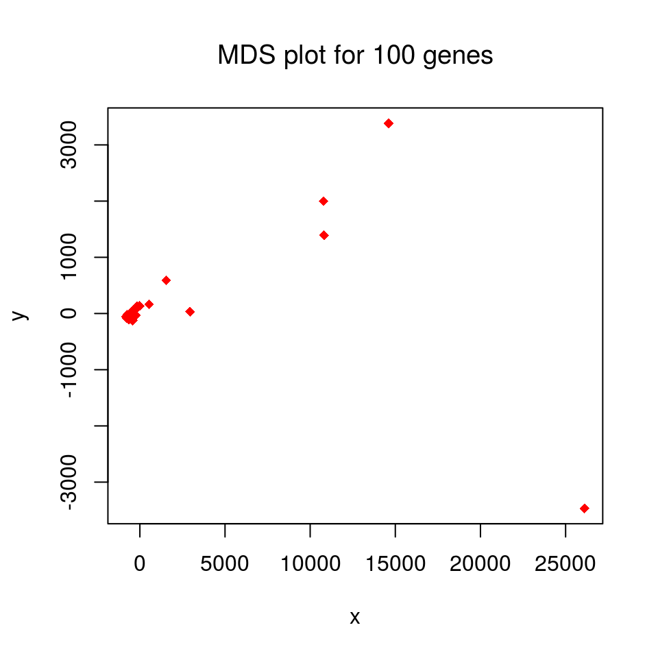 distance = dist(t(small), method = "euclidean") # dist computes distances between the rows of a matrix.