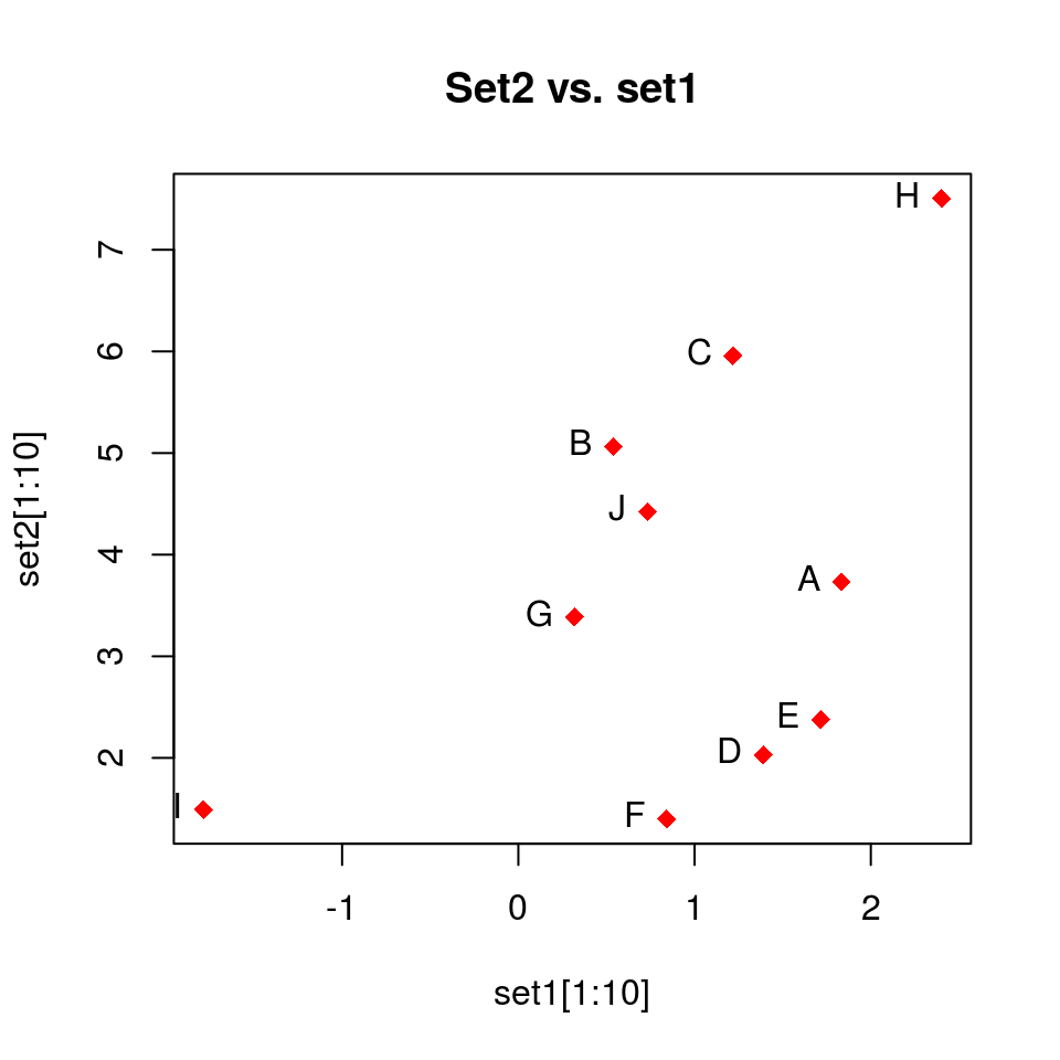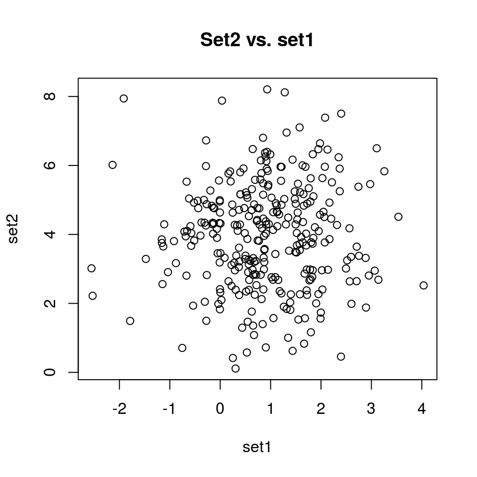 plot(set1, set2, main = "Set2 vs. set1") # set2 vs. set1