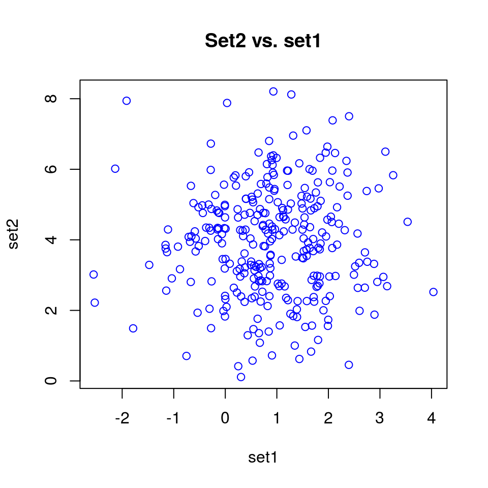 plot(set1, set2, main = "Set2 vs. set1", col = "blue")