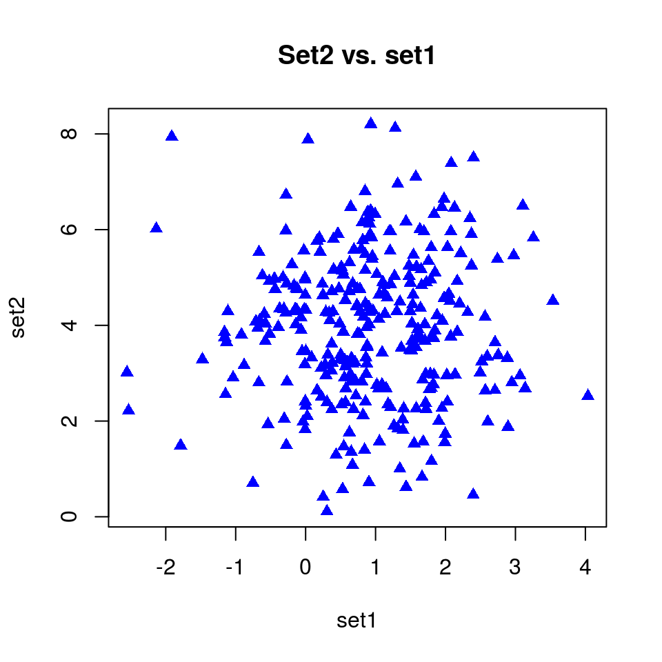 plot(set1, set2, main = "Set2 vs. set1", col = "blue", pch = 17)