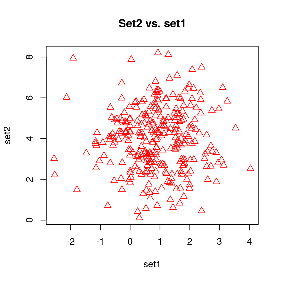 plot(set1, set2, main = "Set2 vs. set1", col = "red", pch = 2, cex = 1.2)