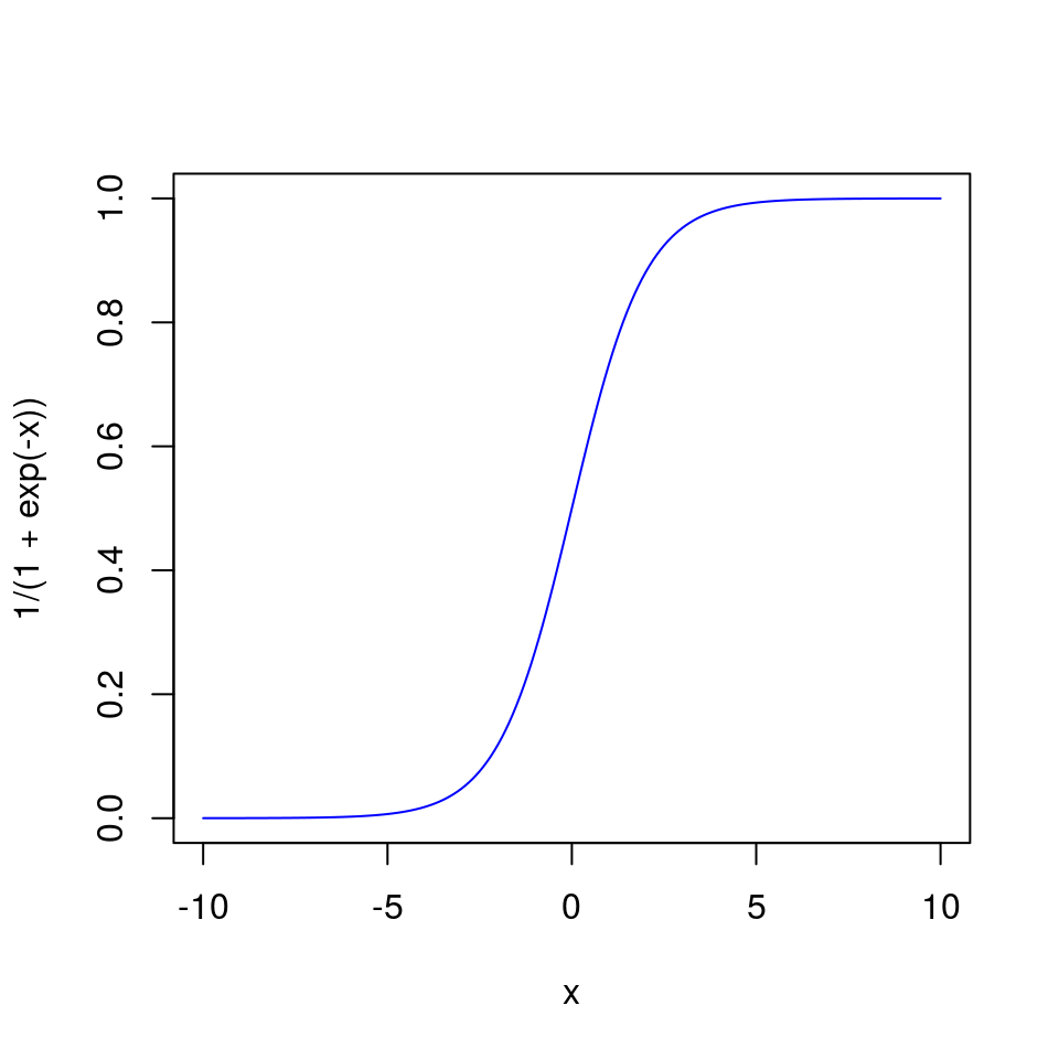 ?curve curve(1/(1+exp(-x)), from = -10, to = +10, n = 201, col = "blue")
