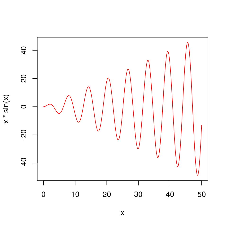 curve(x*sin(x), from = 0, to = 50, n = 401, col = "red")