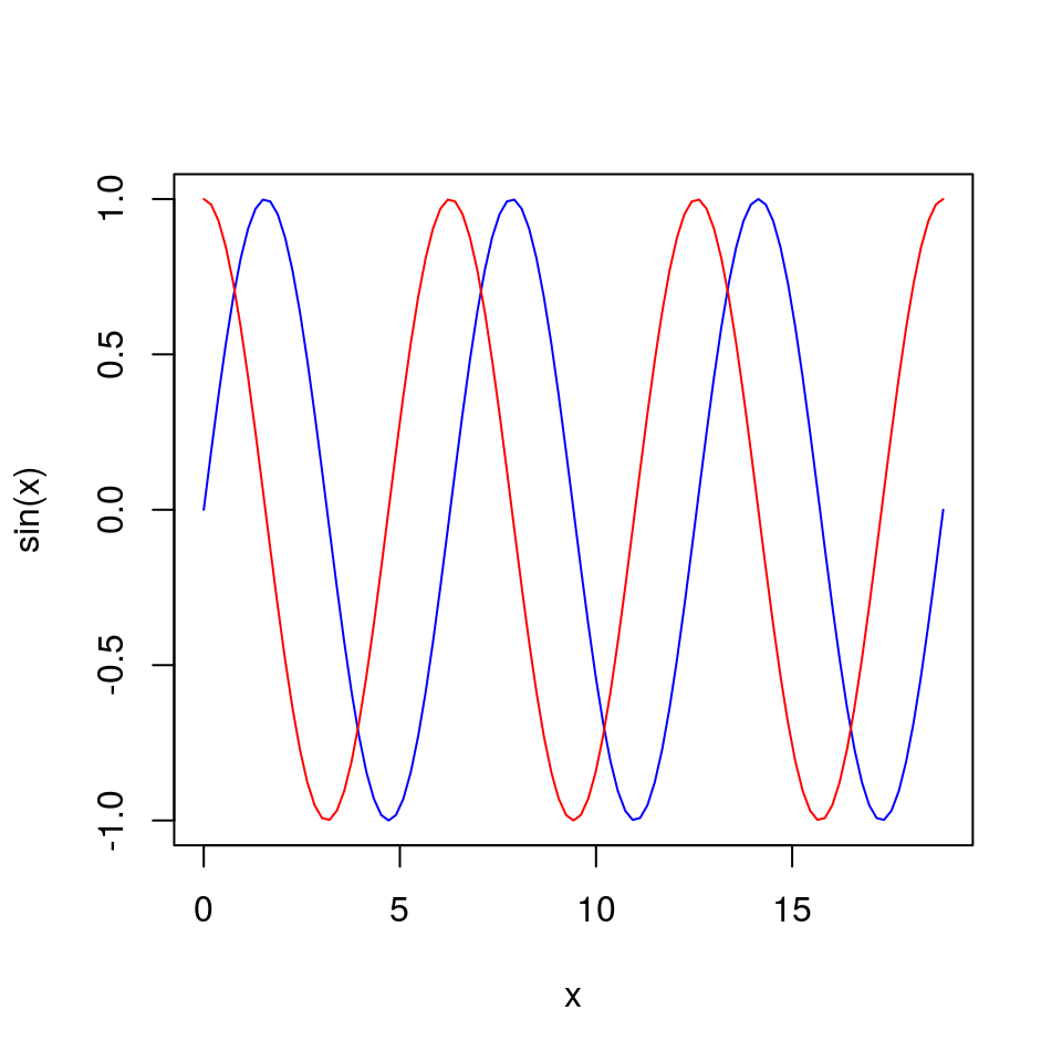 curve(sin(x), from = 0, to = 6*pi, col = "blue") curve(cos(x), from = 0, to = 6*pi, col = "red", add = TRUE)