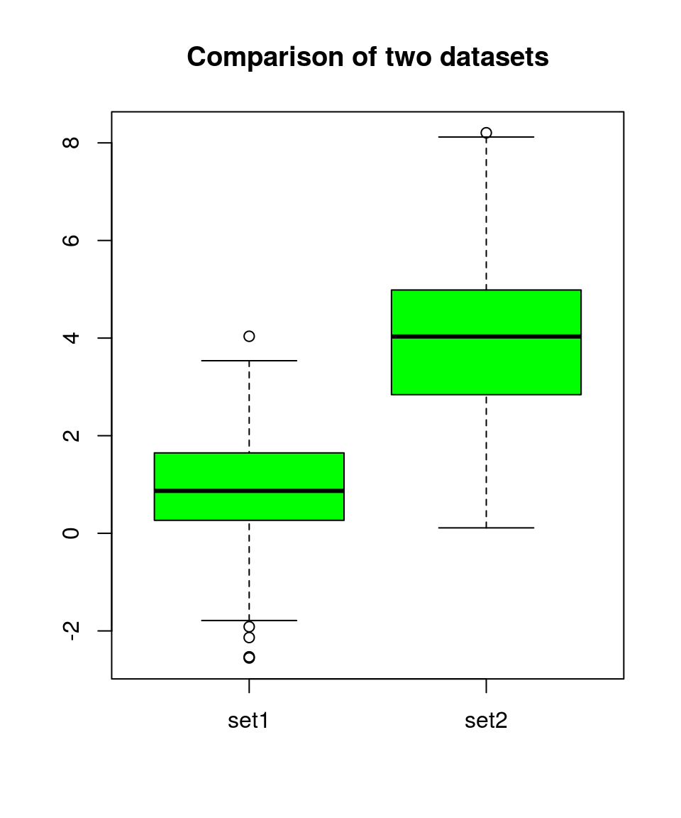 boxplot(sets, col="green", names=c("set1", "set2"), main="Comparison of two datasets")