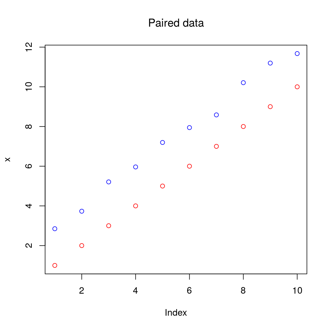 plot(x, ylim = c(min(x,y), max(x,y)), col = "red", main = "Paired data", font.main = 1)