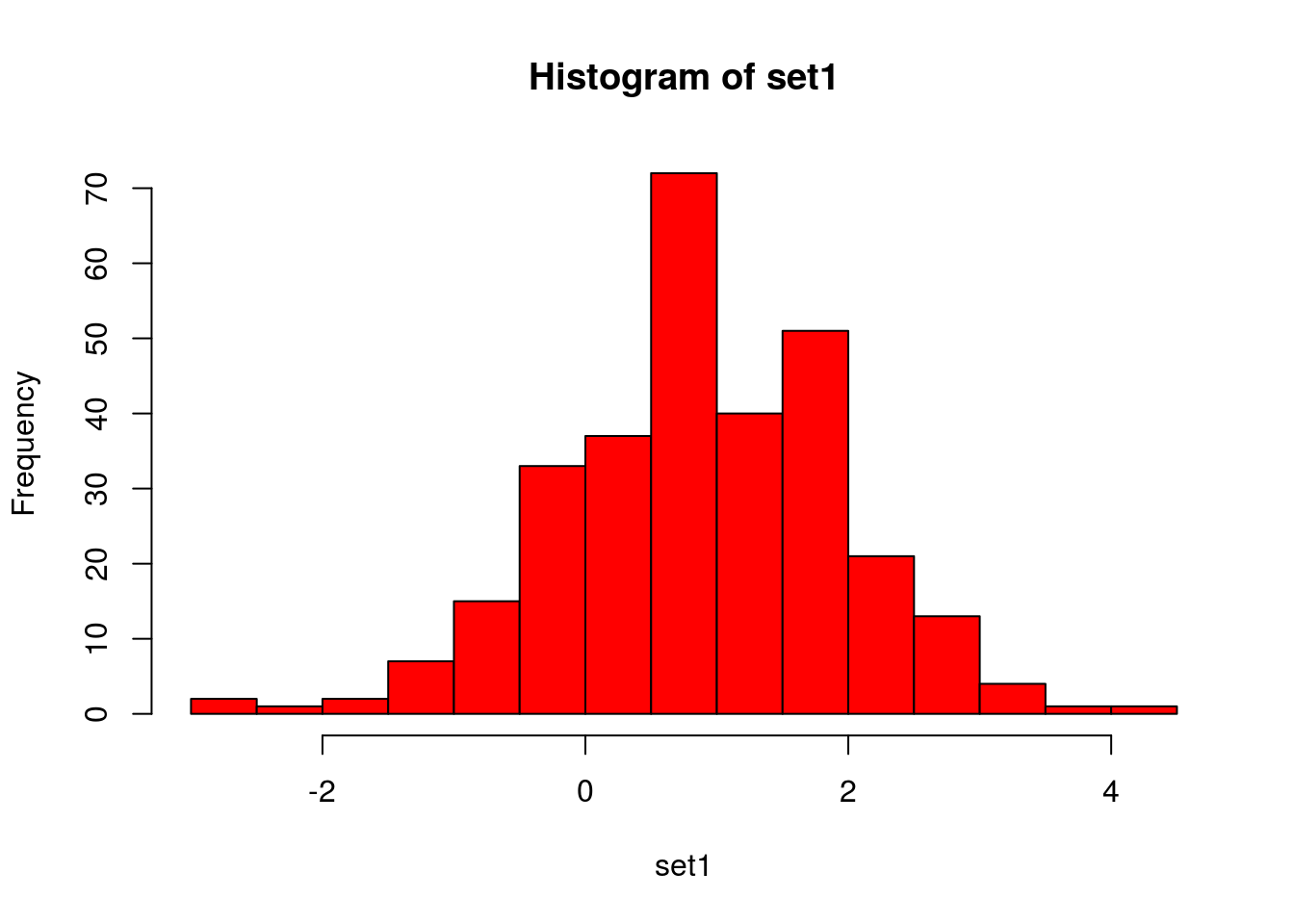 hist(set1, col = "red", breaks = 20) # does it approximately resemble a normal distribution?